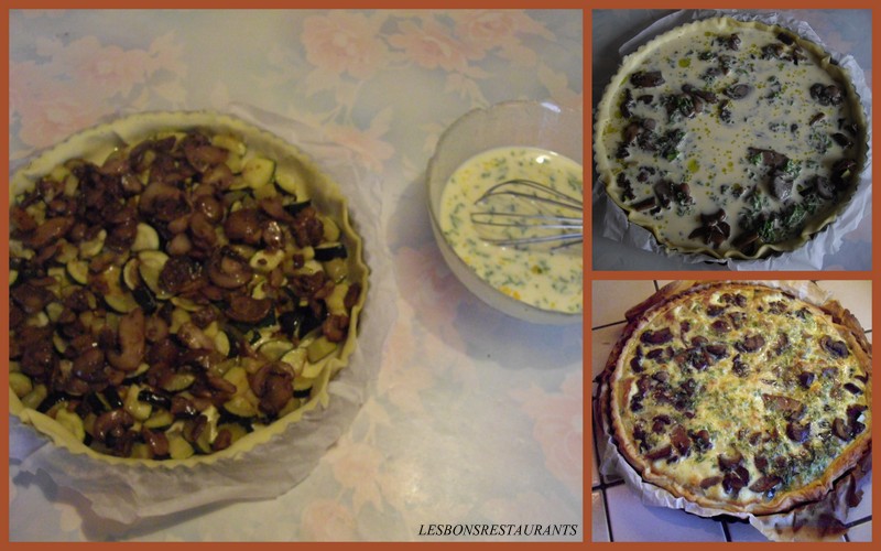Faites-les revenir dans une poêle avec un peu d'huile d'olive. Émiettez le bouillon cube et poursuivez la cuisson 5 minutes. Foncez un moule à tarte avec la pâte. Piquez-en le fond avec une fourchette. Versez-y les courgettes. Prenez la même poêle, faites revenir les champignons quelques minutes et mettez-les par-dessus les courgettes.