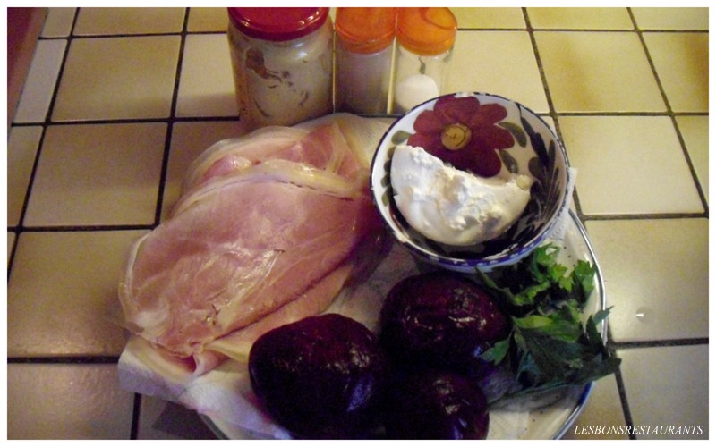 -betteraves cuites -1 ou 2 tranches de jambon blanc -quelques branches de persil -100g environ de ricotta -1 càc de moutarde forte -sel, poivre