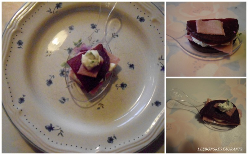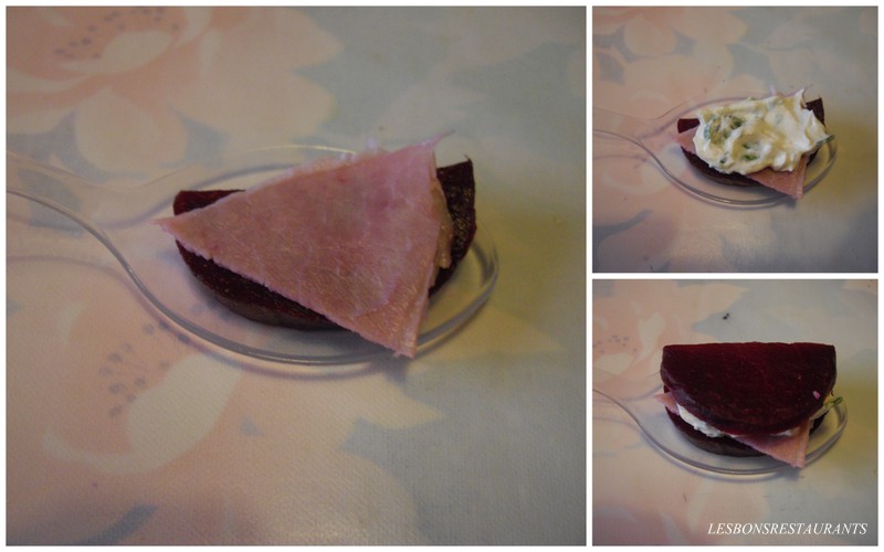 J'ai servi ces millefeuilles de betterave sur une cuillière apéritive.
