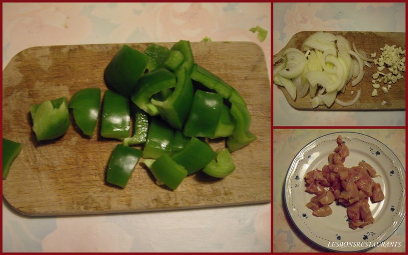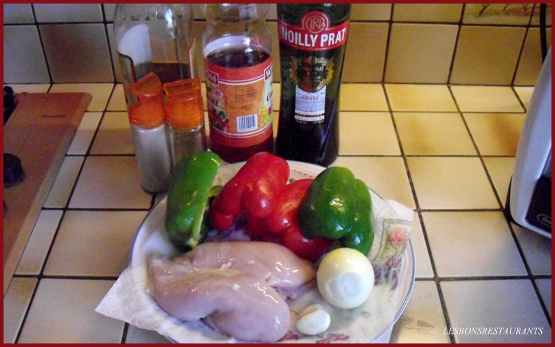 -1 ou 2 filets de poulet -1 poivron rouge et 1 poivron vert -1 oignon -1 gousse d'ail -2 mesure d'huile d'olive -1/2 verre de Noilly Prat -1/2 mesure de vinaigre de Melfor -sel, poivre