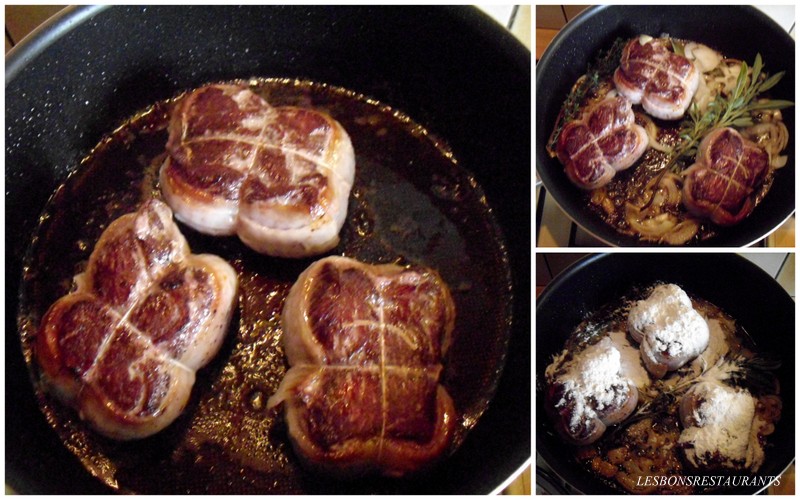 -paupiettes de boeuf -beurre -huile d'olive -2 verres de vin blanc -2 verres d'eau -sel, poivre, bouquet garni -1 oignon -tomates -champignons -quelques gouttes d'arôme patrelle -1 càs de farine