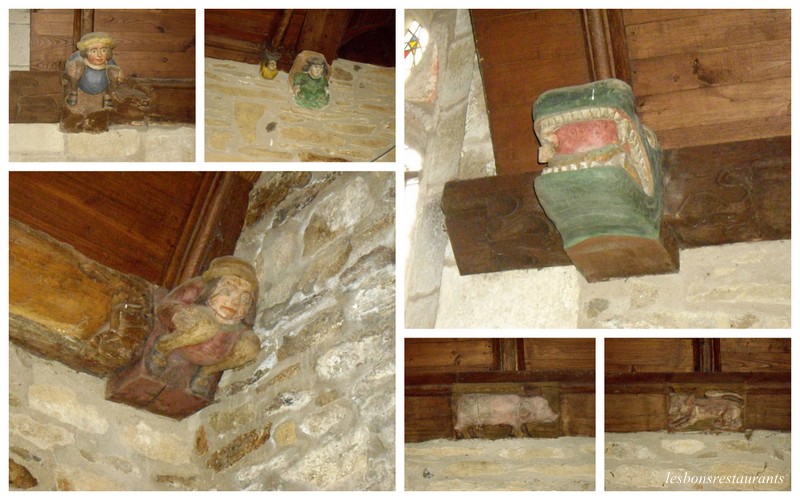 La voûte de l'église repose sur une sablière ornée de sculptures d'animaux.