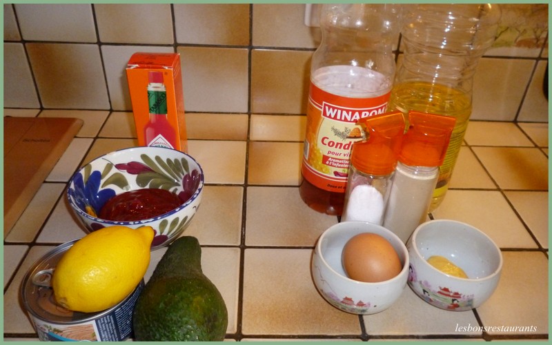 pour une mayonnaise: -1 jaune d'oeuf -1 càs de moutarde forte -huile -vinaigre de miel -sel, poivre pour la sauce au guacamole -un bol de mayonnaise -1 avocat -1 boîte de thon au naturel -2 càs de ketchup -1 citron -quelques gouttes de tabasco