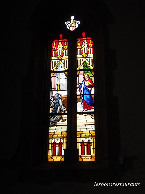 Cet Ankou date du 17e siècle. Il est probablement le dernier existant encore en Bretagne. Vous pouvez revoir l'article que nous lui avons consacré sur ce lien. L'Ankou est la figure légendaire de la mort! Cette statue a longtemps été vénérée comme un saint un peu spécial.... En effet, par des prières adressées à "Erwannig Plouillio"(le petit Yves de Ploumilliau) on pouvait obtenir la mort d'un ennemi! Vitrail représentant saint-Joseph, saint-Cado et saint-Vincent Ferrier.