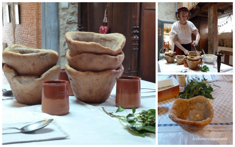 Potage Mortereul et Faulx Grenon. C'est un potage de légumes qui a mijoté toute la matinée sur le coin du feu et qui a été agrémenté de lard, de saucisses et de carcasses de volaille. Bien sur, il est servi dans des écuelles. Ici, ce sont des écuelles réalisées en pâte à pain.