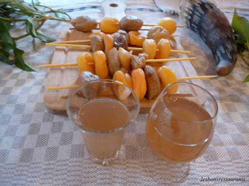 Ce jour là, des petits carrés de lin en font office. Ils n'ont pas été ourlés..mais à l'époque on ne faisait pas trop de couture! Le repas débute avec, en apéritif, un petit verre de Claret et une brochette de fruits.