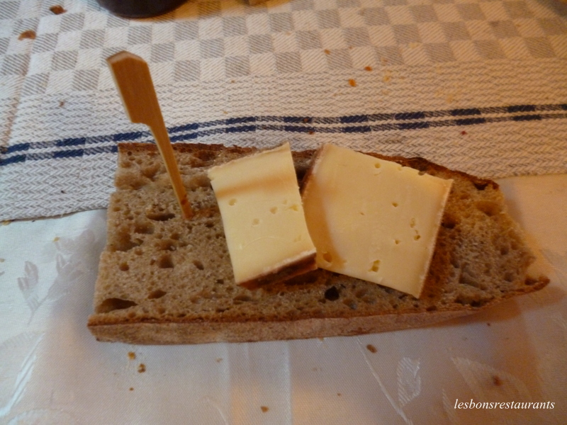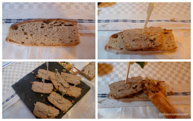 Pâté de volaille Salade d'oignons rôtis Gros bâton Pour ce second met, un tranchoir est distribué à chacun d'entre nous. Le tranchoir est une large tranche de pain, qui va servir à disposer tous les mets. En fait, ce tranchoir va nous servir d'assiette tout au long du repas. En fin de repas, on ne le mange pas... Les tranchoirs sont distribués aux gueux! Le gros bâton est réalisé comme une pâte brisée. Il va nous servir à déguster ce délicieux pâté ainsi que la salade d'oignons rôtis!