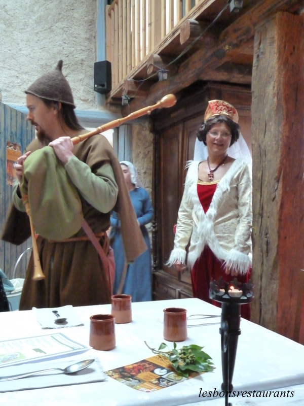Les repas d’antan sont devenus au fil des années un moment convivial où l'on apprécie de retrouver des plats mijotés comme les faisaient nos grands mères, au goût et au parfum d’autrefois. L'année dernière, nous avons eu la chance de pouvoir participer au repas d'antan à la ferme auberge "Le domaine de Saturnin" sous le signe de "La Renaissance" (voir les deux articles sur ce lien). Cette année, nous avons participé à un repas d'antan "médiéval" toujours dans la même ferme-auberge, la ferme-auberge Le Domaine de Saturnin située 5 rue de la source à Bernécourt en Meurthe-et-Moselle. Dans le cadre de ce thème, un jongleur s'est immiscé entre deux plats pour nous jouer l'aubade ou afin de nous narrer quelques belles histoires moyenâgeuses! Dans un premier temps, je vous présenterai le repas proprement dit, puis dans l'article suivant, vous verrez notre jongleur et tous ses instruments(voir l'article de ce spectacle sur ce lien)! Cliquez sur les photos pour les agrandir! À l'époque du roi Arthur et des chevaliers de la table ronde la table est toujours garnie d'une grande nappe blanche.