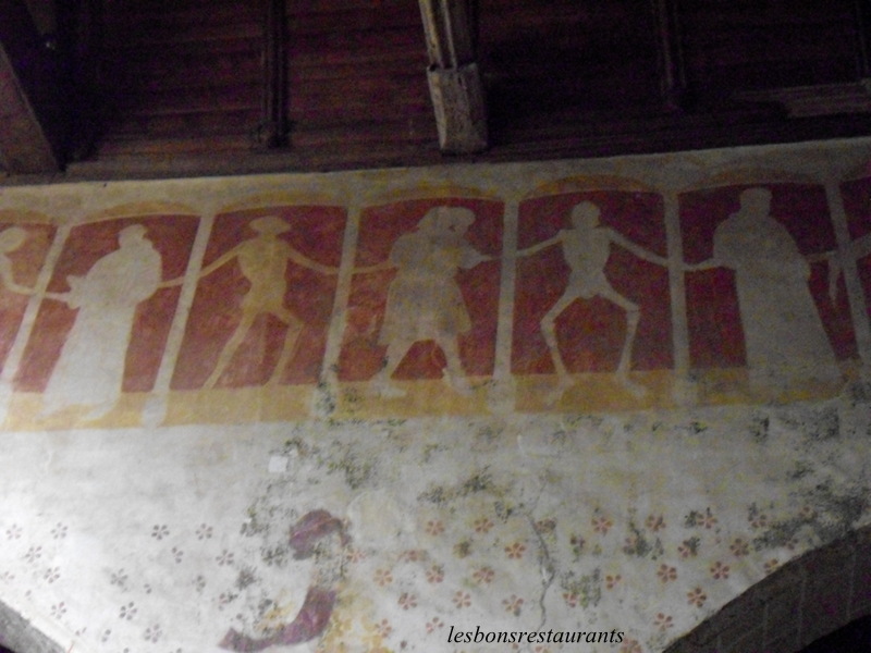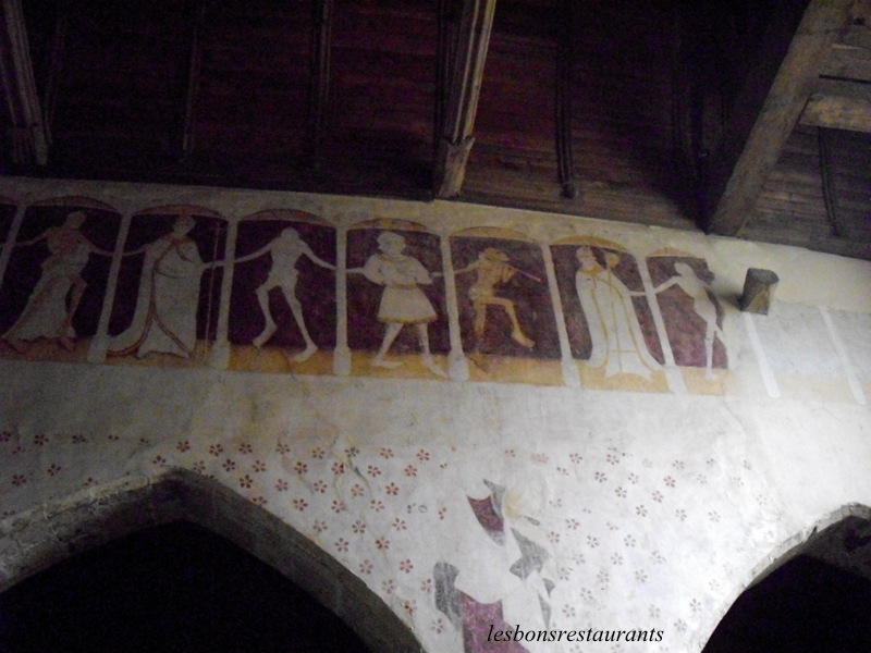 | La chapelle Kermaria an Iskuit est située dans le petit bourg de Kermaria près de Plouha dans le département des Côtes d'Armor. Très connue pour ses fresques murales représentant une Danse macabre, nous nous y sommes arrêtés lors de notre dernier voyage en Bretagne. Après avoir fait le tour extérieur puis visité l'intérieur, nous allons aujourd'hui, vous faire découvrir l'élément artistique principal de cette chapelle, la Danse macabre.... Vous pouvez revoir la visite de l'extérieur de la chapelle ainsi que le scénario complet de cette visite sur ce lien. Cliquez sur les photos pour les agrandir! À l'origine, la Danse macabre constituait un sujet de représentations théâtrales populaires. Elle prenait donc la forme d'échanges verbaux — le plus souvent de quatre lignes — entre la Mort et 24 personnes rangées par ordre hiérarchique.Une représentation eut d'ailleurs lieu à Paris dans le cloître des Innocents en leur mémoire. D'ailleurs, l'une des plus anciennes figurations de Danse macabre connue, apparaît à Paris, en 1424, sur les murs d'un des charniers du cimetière des Innocents. Tout au long du 15e et 16e siècle, ce thème est peint sur les murs des églises et dans les cimetières d'Europe du Nord.  Il est diffusé à travers l'Europe par les textes poétiques colportés par les troupes de théâtre de rues. Cette forme d'expression est le résultat d'une prise de conscience et d'une réflexion sur la vie et la mort, dans une période où celle-ci est devenue plus présente et plus traumatisante. Les guerres, les famines et la peste ont décimé la population. Disparue sous un badigeon, cette fresque a été redécouverte en 1856 par Charles de Taillart.  Elle s'inspire de la fresque du cimetière des Innocents à Paris, dont une gravure sur bois circulait en Europe, notamment durant les périodes d'épidémie de peste. Une Danse macabre entraîne, alternativement et main dans la main, des squelettes et des représentants de la société médiévale, toutes catégories confondues. À Kermaria, la farandole macabre est située en hauteur, de part et d'autre de la nef principale.  Elle commençait par le personnage de l’Acteur, aujourd'hui disparu et qui était chargé de rédiger les sentences morales de huit vers chacune, tracées sous chaque personnage. À la suite de l'Acteur, les squelettes entraînent dans leur monde le pape, l'empereur, le cardinal, le roi, le patriarche, le connétable, l'archevêque, le chevalier, l'évêque, l'écuyer, l'abbé, le bailli, l'astrologue, le bourgeois, le chartreux, le sergent, le médecin, la femme, l'usurier, le pauvre, l'amoureux, le ménétrier son biniou au sol, le laboureur, le cordelier et l'enfant.  Cette Danse macabre est d'autant plus précieuse que son modèle parisien, réalisé en 1424, a disparu en 1786. Les Danses macabres, peintes dans les églises, sont souvent accompagnées d'une autre fresque, celle du "Dit des trois morts et des trois vifs"! La Danse macabre est une étape dans la représentation de la Mort. Alors que la mort présente l'individu mourant, ayant le temps de faire un dernier examen de conscience, la Danse macabre entraîne celui-ci immédiatement en montrant une Mort insensible aux inégalités sociales. Et ce thème apparaît aussi dans la légende du "Dit des trois morts et des trois vifs". Le Dit des trois Morts et des trois Vifs représente, sous forme de peinture, trois cadavres s'adressant à trois jeunes cavaliers richement parés, souvent en train de chasser. Dieu, voulant les avertir, met les trois cavaliers en présence de trois morts décharnés. Chaque personnage prend ensuite la parole, puis, dans la conclusion, les morts laissent les vivants pâles et apeurés, tirant la morale: « Menons la vie qui plaît à Dieu, gardons-nous d'aller en enfer, sachons que la mort nous saisira aussi, et prions Notre-Dame, à l'heure de notre mort, d'être près de son fils. » Cette dernière légende figurait, jadis, sur toute la hauteur d'un mur intérieur de la chapelle. Cette fresque, de 7m de long, est en bien mauvais état, tout comme la danse macabre. Mais lors de notre visite, nous avions appris qu'il était prévu de restaurer ces peintures. Si vous êtes de passage dans cette région, arrêtez-vous! Bonne journée!