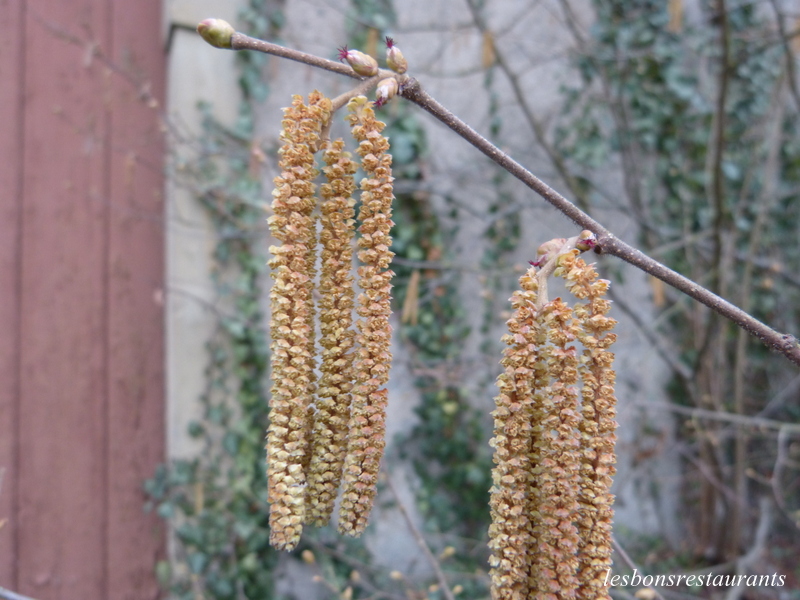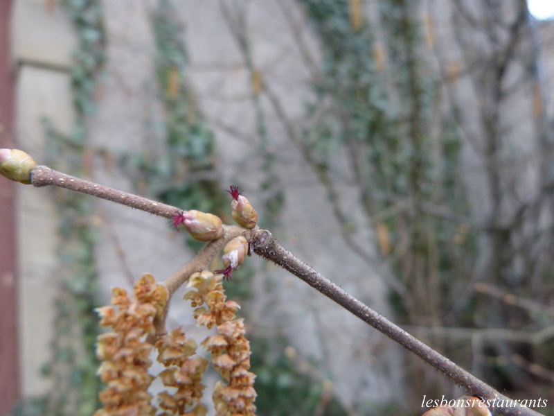 Avec l'aide d'Alexandra, j'ai pu prendre un noisetier. À cette époque de l'année, le noisetier voit la mariage entre la fleur mâle et la fleur femelle. Si tout se passe bien, cette petite fleur rouge donnera une noisette!