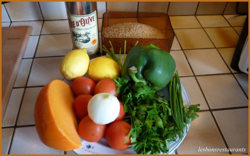 -400g de boulgour (pour 6 personnes) -6 tomates -1 poivron vert pelé et épépiné -200g de mimolette -persil, ciboulette -sel, poivre -2 citrons -vinaigre -huile