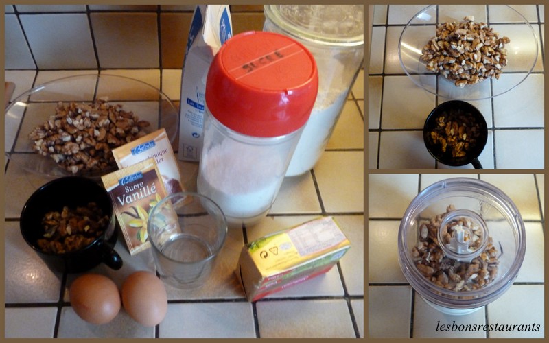 | Lors d'un de nos séjours dans le Lot, pays de la noix, nous avons découvert une superbe recette de gâteau aux noix. Aujourd'hui, je cuisine le gâteau aux noix et sa crème anglaise.   Les ingrédients pour cette recette: -2 verres de farine -1 sachet de levure chimique -2 verres de sucre -1 sachet de sucre vanillé -1 verre de lait -3 oeufs -100g de beurre fondu -150g de cerneaux de noix mixés -50g de cerneaux de noix entiers pour la décoration   Faites fondre le beurre à feu doux puis laissez-le tiédir. Mixez les noix tout en gardant quelques cerneaux pour la décoration. Cassez les oeufs en séparant les blancs des jaunes. Battez les jaunes d'oeuf avec le sucre et le sucre vanillé jusqu'à ce que le mélange deviennent mousseux et blanchisse. Incorporez le lait, la farine, la levure, le beurre fondu et la poudre de noix. Mélangez soigneusement. Battez les blancs en neige puis incorporez-les délicatement dans la préparation précédente.   Beurrez et farinez un moule à manquer. Versez la pâte dans le moule et faites cuire votre gâteau dans un four à 200° pendant 30 minutes. Démoulez-le doucement et disposez les cerneaux de noix restant sur le gâteau.   Ce gâteau s'accompagne parfaitement d'une crème anglaise. Nous vous invitons à voir ou revoir notre recette de crème anglaise sur ce lien. Bon appétit! Vous pouvez retrouver d'autres idées desserts sur ce lien.