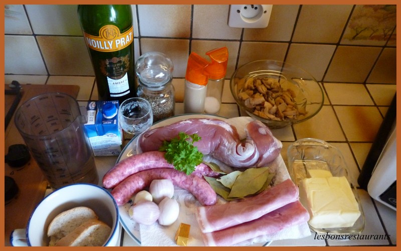 -1 filet mignon -2 saucisses de Toulouse -4 échalotes -1 gousse d'ail -persil -feuilles de laurier -250g de champignons de parie -2 tranches de pain rassis -2 cs de crème fraîche -2 tranches de jambon blanc -1 bouillon cube -1 verre de noilly pratt -50g de beurre -sel, poivre