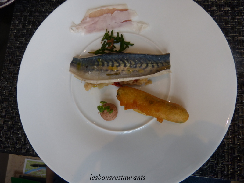 En entrée, Marc a choisi un maquereau mariné au vin blanc servi avec du citron confit, des tomates séchées, du lard et du jambon ainsi qu'un mesclum d'herbes.