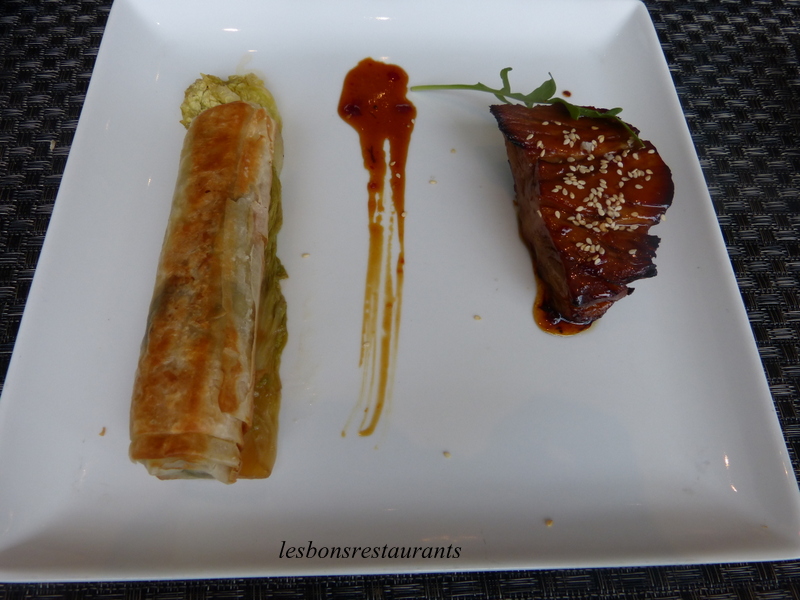 ...ou une pièce d'échine de porc confite 10 heures puis laquée et servi avec un nem de légumes croquants sautés au gingembre.