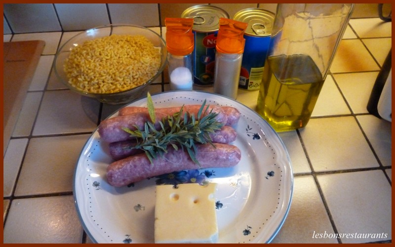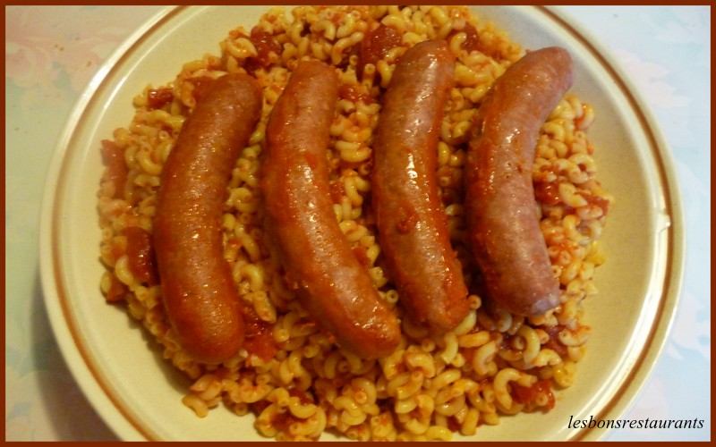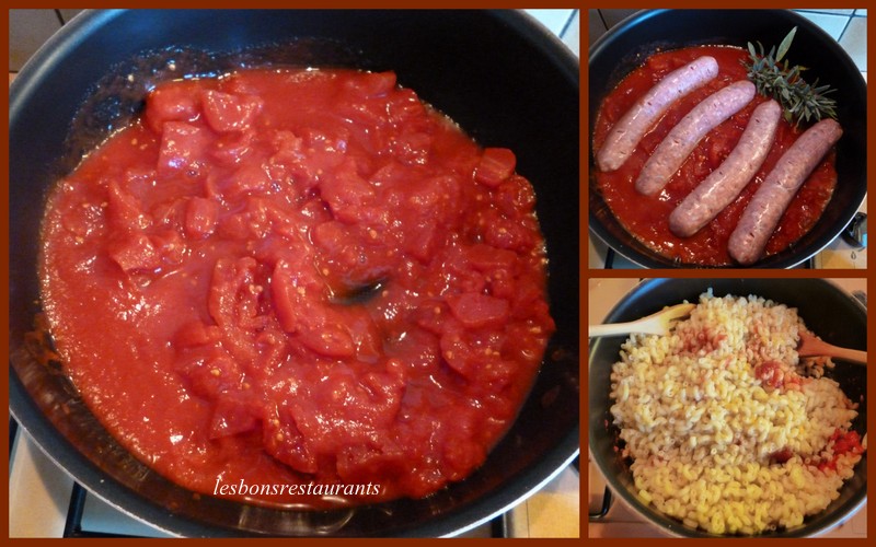 Aujourd'hui, je cuisine les saucisses aux tomates.