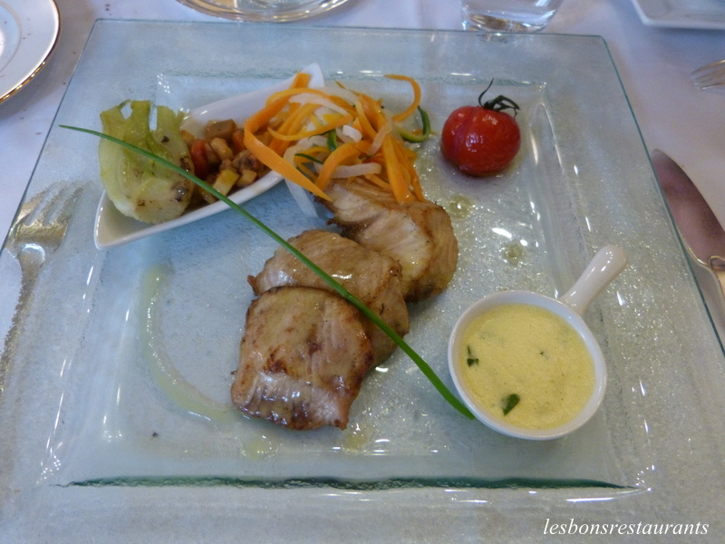 Pour le plat, Marc déguste avec gourmandise des escalopines d'esturgeon d'Aquitaine à la plancha, béarnaise de fenouil et tagliatelles de légumes.