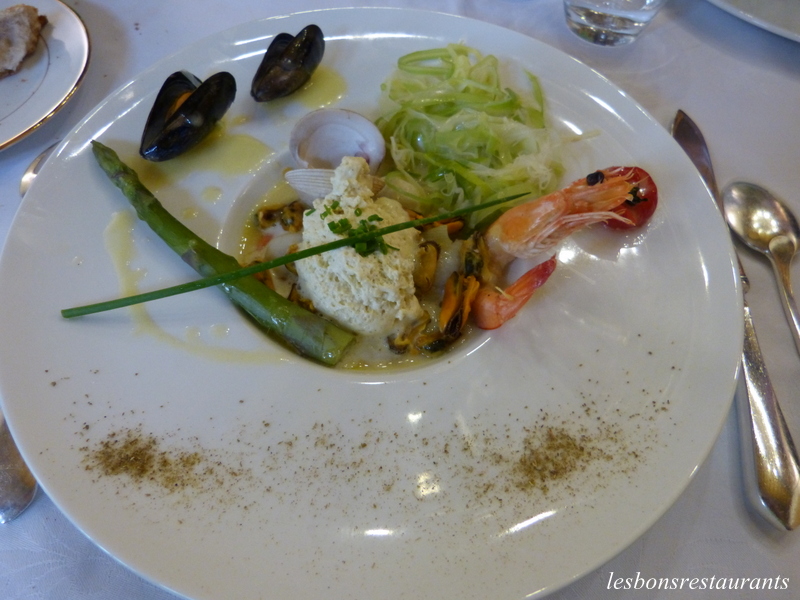 Nage de médaillons de lotte et fruits de mer aux filaments de légumes, cappuccino aux fines herbes et cumin pour moi.