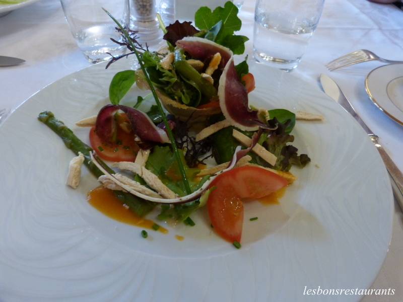 Marc a préféré la salade croustillante, feuille de brick, émincé de blanc de volaille, jambon de canard séché maison et sa vinaigrette de tomates fraîches.