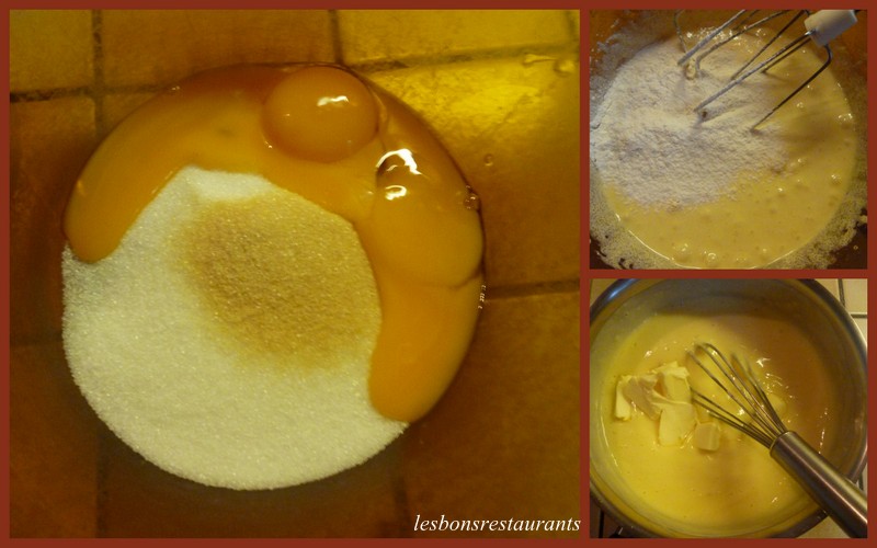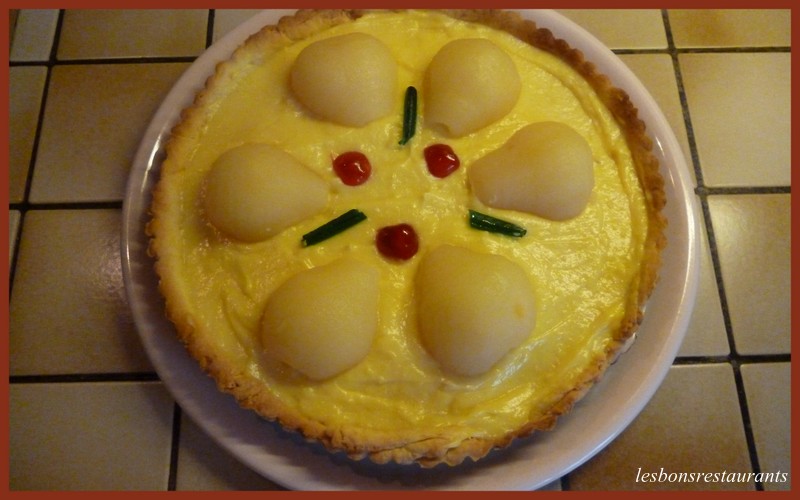 | Beaucoup de douceur....un rien de gourmandise! Aujourd'hui, je cuisine la tarte à la crème et aux poires.   Les ingrédients pour cette recette: -1 oeuf entier -4 jaunes d'oeufs -160g de sucre -1 pincée de sel -250g de farine tamisée -125g de beurre mou -0,25 litre de lait -1 petit verre à liqueur de mirabelle -30g de beurre -poires dans le sirop -quelques fruits confits   Préparation de la pâte sablée: Travaillez l'oeuf entier avec le sucre et le sel de façon à obtenir un mélange mousseux. Ajoutez la farine d'un seul coup et travaillez ce mélange de façon à former un sable grossier. Incorporez ensuite le beurre mou divisé en morceaux. Travaillez afin d'obtenir une boule de pâte. Mettez-la de côté et laissez-la reposer pendant 2 heures.   Pendant ce temps préparez la crème: Travaillez les jaunes d'oeufs avec le sucre. Incorporez la farine puis le lait et le petit verre de mirabelle. Mettez ce mélange à épaissir sur feu doux. Retirez du feu aux premières ébullitions. Ajoutez 30g de beurre. Laissez refroidir en remuant de temps en temps.   Foncez un moule à tarte de votre pâte sablée. Recouvrez de papier d'aluminium ou d'une feuille de papier sulfurisée. Déposez des haricots secs et faites cuire la pâte à blanc pendant 25 minutes dans un four à 180°.   La pâte est cuite, la crème est refroidie! Égouttez les poires. Garnissez le fond de la tarte de crème. Posez les demi poires par-dessus et décorez à l'aide de fruits confits. Bon appétit! Vous pouvez retrouver d'autres idées desserts sur ce lien.