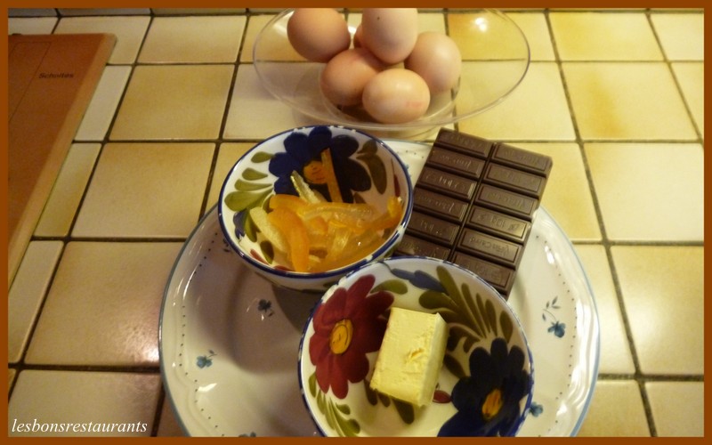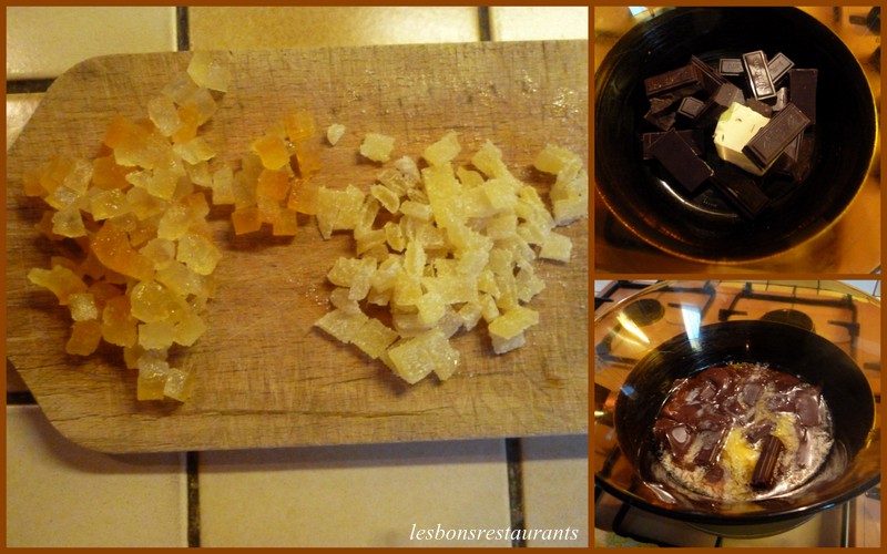 (6 coupelles) -60g de fruits confits + 20g pour le décor (écorce d'orange, écorce de citron, gingembre) -200g de chocolat noir pâtissier -6 oeufs -40g de beurre