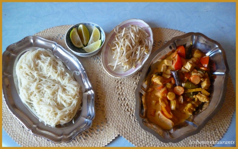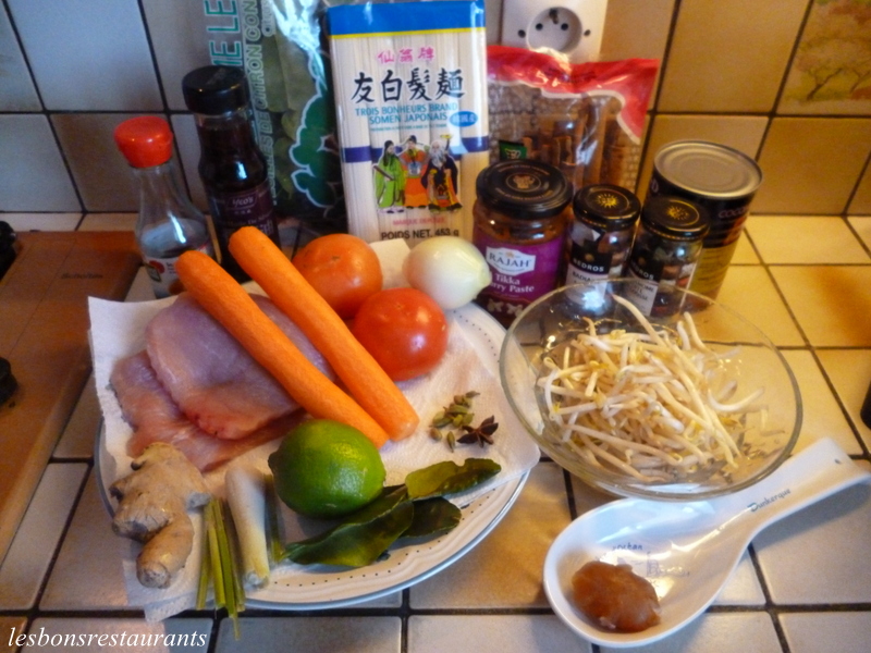 (6 personnes) -350g d'escalopes de dinde -1 càc de pâte de curry tikka -1 bâton de cannelle -1 étoile de badiane -6 cardamones -4 feuilles de lime -gingembre râpé -2 tiges de citronnelle -1 oignon -1 bouillon cube fait maison (voir le lien) -400ml de lait de coco -6 càs de nuoc mam -250g de nouilles somen -huile de sésame -2 carottes -2 tomates -100g de pousses de soja -1 citron vert -1 bouquet garni Tous les produits asiatiques viennent de notre épicier, dont les conseils nous ont été précieux pour la réalisation de cette recette.