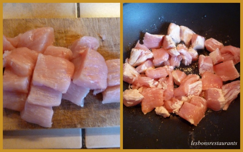 Coupez les filets de dinde en petits morceaux et faites-les sauter dans un wok avec un filet d'huile de sésame.