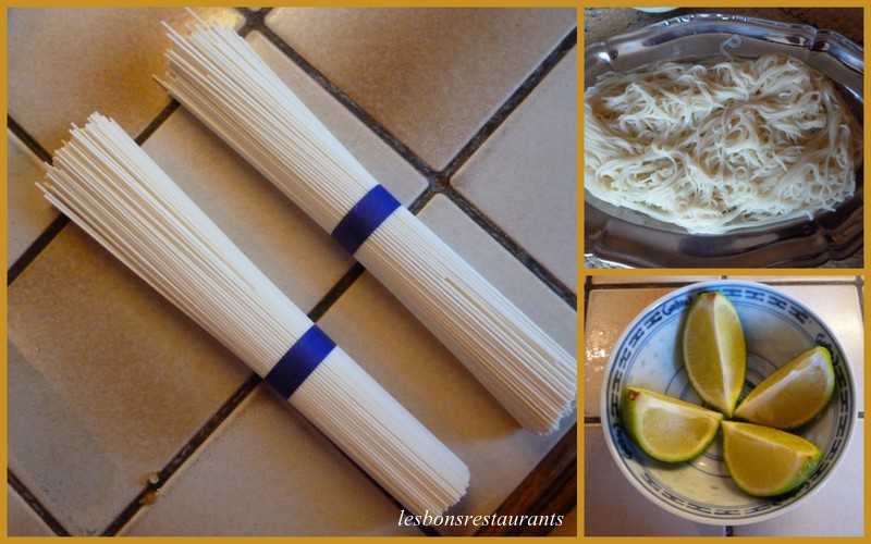 Faites bouillir une grande quantité d'eau. Mettez les nouilles par petites quantités dans l'eau afin qu'elles ne collent pas. Laissez-les cuire 3 minutes. Égouttez-les et rincez-les plusieurs fois. Coupez le citron en quartiers.