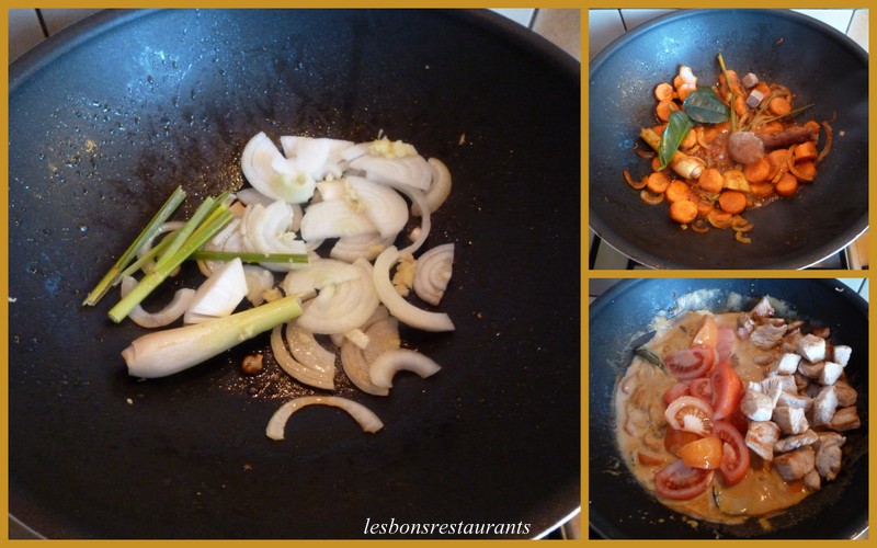 Faites-les suer dans le wok. Ajoutez-y les tiges de citronnelle, le gingembre râpé et la pâte de curry tykka. Astuce: Pour cette recette vous adaptez la quantité de curry en fonction de vos goûts.