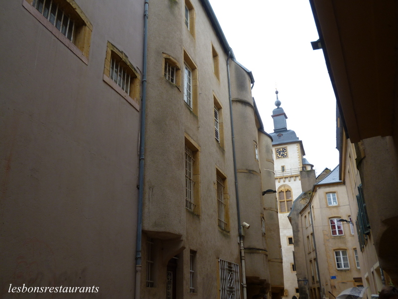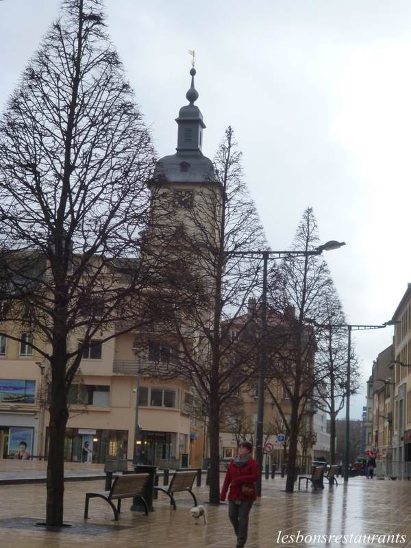 Comme toutes les villes du Moyen Âge, Thionville érigea son beffroi afin de s'émanciper des autorités seigneuriales et épiscopales. Construit au 14ème siècle, il fut à de nombreuses reprises remanié pour lui donner cette allure actuelle si caractéristique. On ne peut le manquer avec sa toiture d'ardoises avec sa lanterne, son chapeau et son bulbe en oignon. Je ne pouvais pas passer à côté de ce très bel immeuble!