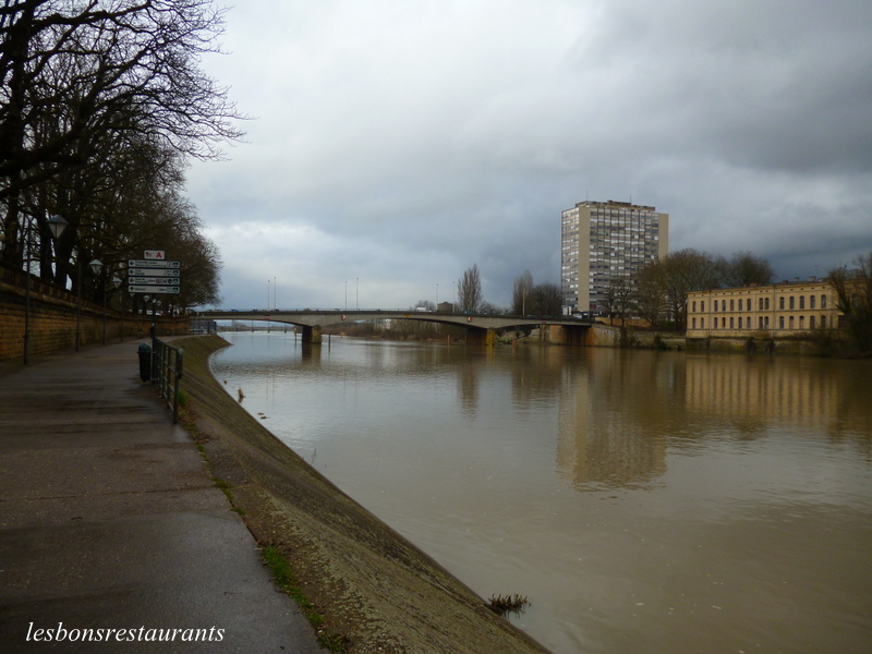 Du pont des alliés, nous avons une vue sur un des ponts-écluses de Thionville. Ce pont-écluse fut construit entre 1746 et 1752 par Louis de Cormontaigne, ingénieur du roi, pour éviter à la ville de Thionville de subir des dégâts consécutifs aux inondations hivernales. Après un petit tour, nous repassons le pont et nous suivons la Moselle!