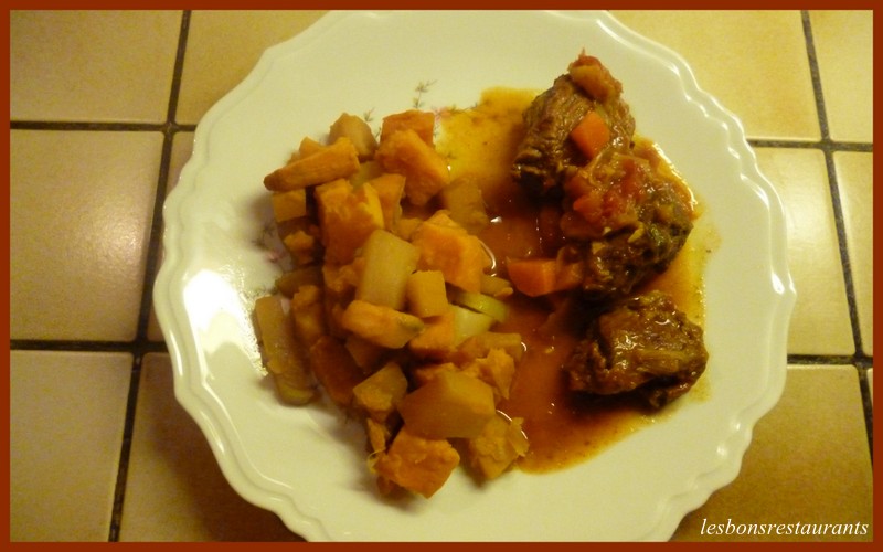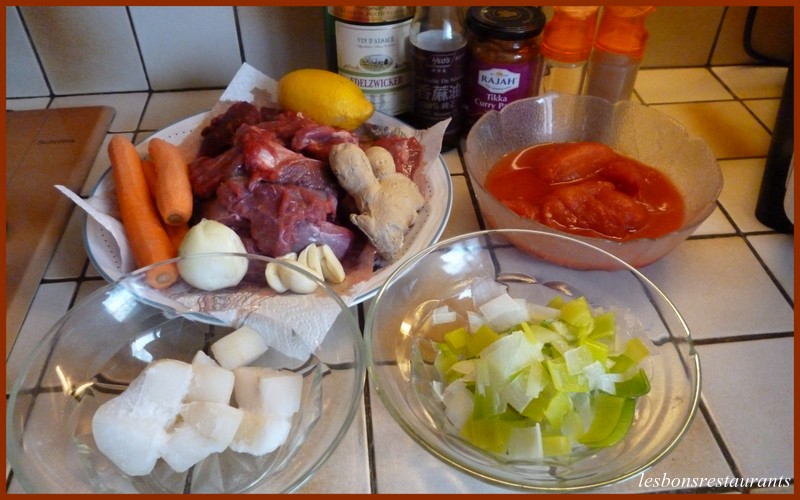 (6 personnes) -1 kg de paleron de boeuf -100g de poireau -100g de carottes -100g de navets -1 oignon -2 gousses d'ail -200g de tomates pelées -1 citron -sel, poivre -1 càc de pâte de curry tikka masala -40cl de vin blanc -40cl de bouillon -huile de sésame