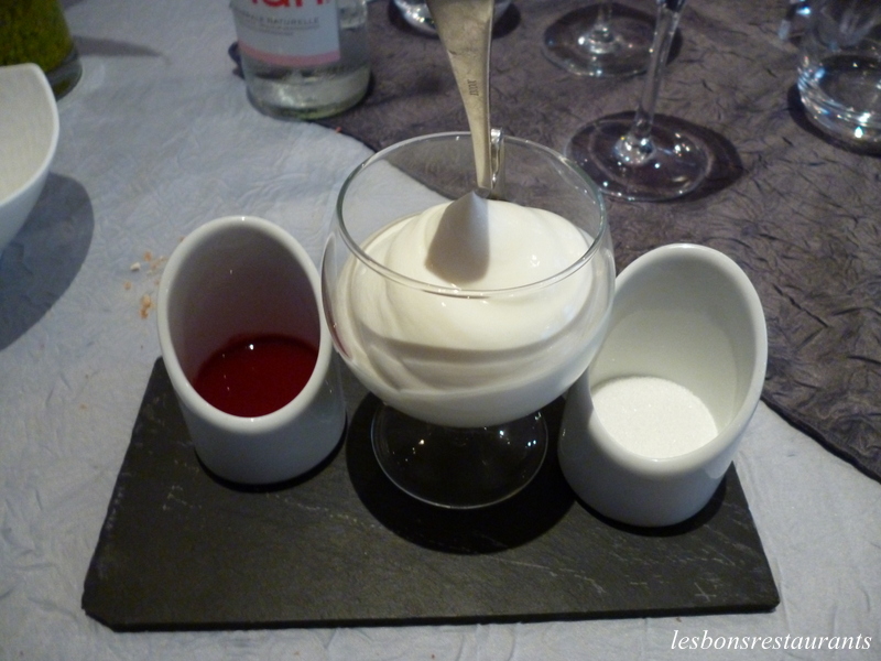 Pour le dessert, Marc a choisi le fromage blanc servi avec du sucre et un coulis de fruits rouges.
