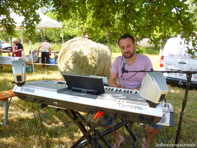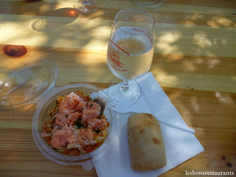 Ce taboulé est accompagné de saumon frais. Bien rafraîchissante, cette salade a été appréciée par tous! J'en profite pour féliciter toute une organisation qui a fait que les plats soient restés bien frais! Nous dégustons l'entrée de cette marche gourmande sous l'oeil bienveillant d'un musicien qui nous enchante par des musiques que nous reprenons en coeur.