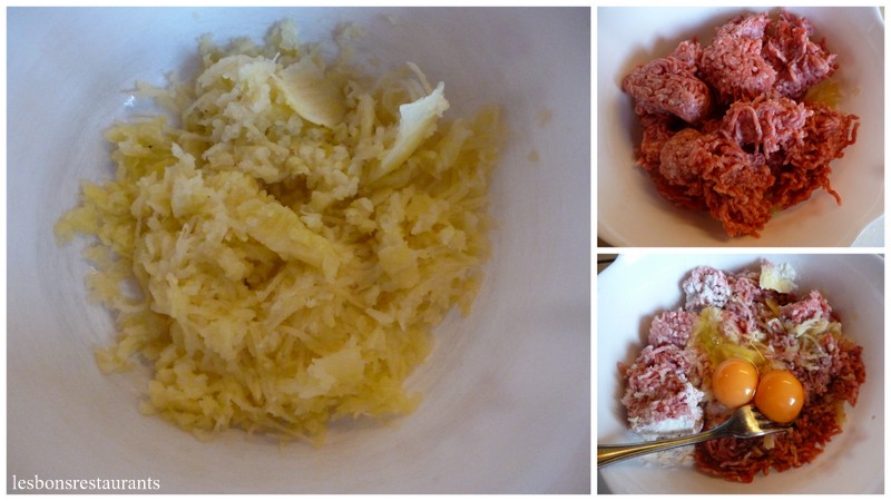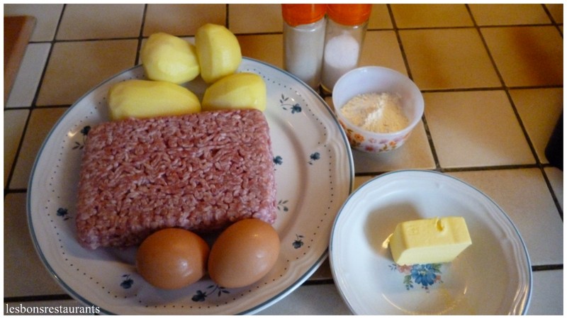 (4 personnes) -500g de hachis -2 càs de farine -4 pommes de terre -2 oeufs -50g de beurre -sel, poivre