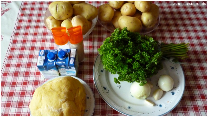 (8 personnes) -700g de pâte brisée (voir la recette sur ce lien) -2kg de pommes de terre -0,25l de crème fraîche -1 oignon -1 gousse d'ail -1 bouquet de persil -sel, poivre