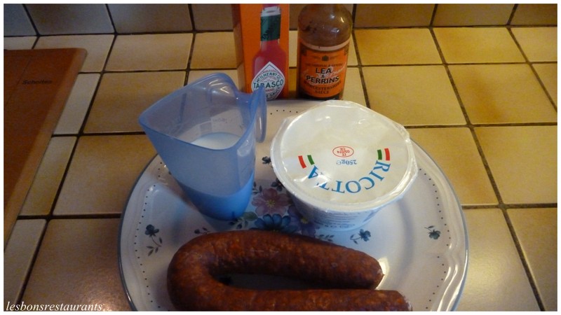 (6 personnes) -225g de chorizo doux -100ml de lait -150g de ricotta -1 goutte de worcestershire -1 goutte de tabasco