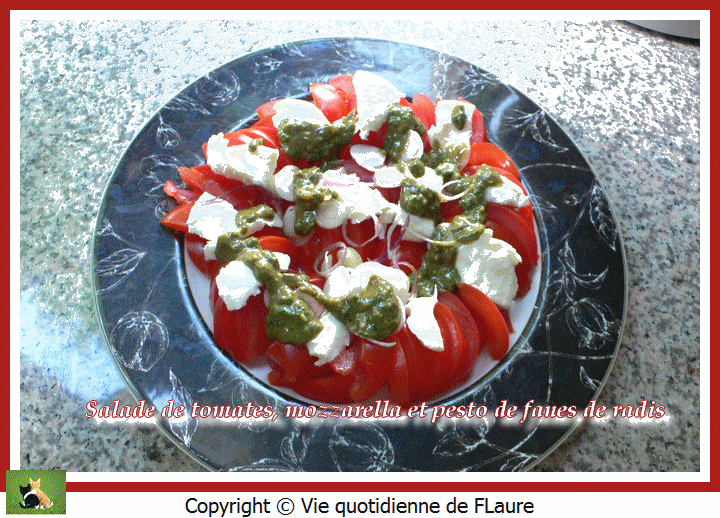 FLaure a mis sa petite touche personnelle en réalisant sa salade de tomates avec du pesto de fanes de radis. Un grand merci à FLaure pour cette superbe réalisation. Bonne journée! Je vous invite à voir ou revoir le récapitulatif de "MES RECETTES ET VOUS" sur ce lien.