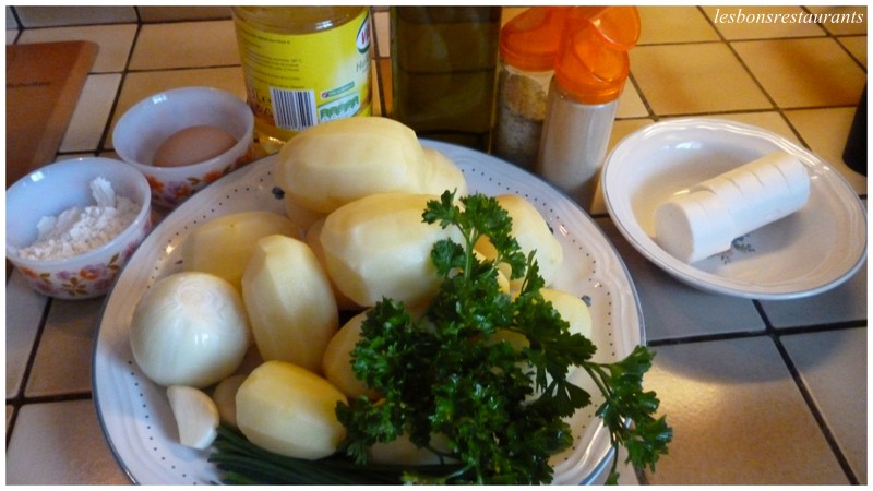 -1kg de pommes de terre -1 œuf -1 cuillère à soupe de farine -1 oignon -1 gousse d’ail -du persil et de la ciboulette -sel, poivre -huile -fromage de chèvre frais -3 tomates