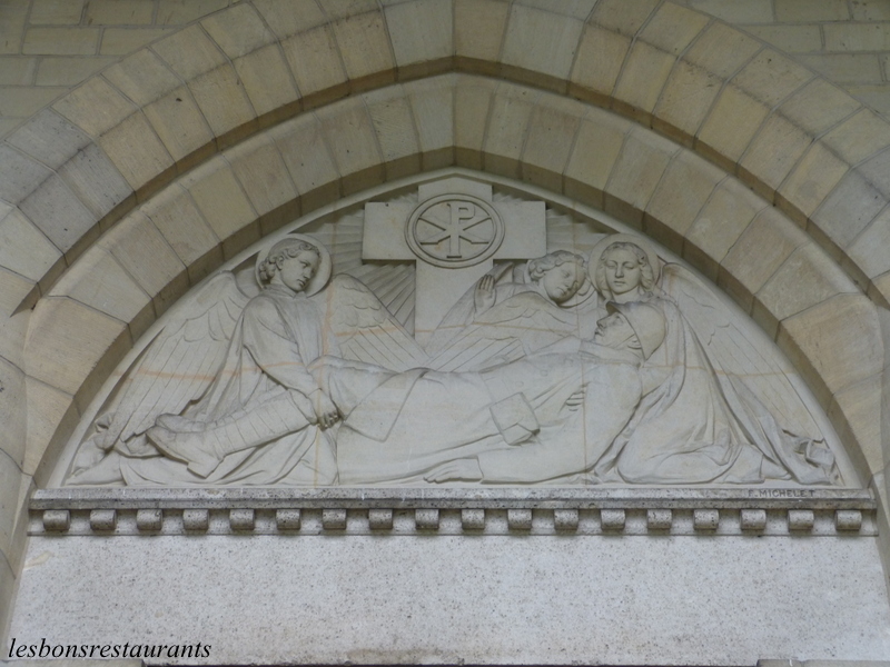 Au tympan de la porte se situe un bas relief d’anges déposant, au pied de la croix, un soldat mourant, avec l’inscription : « in paradisium deducant te angeli » (que les anges te conduisent au paradis)!