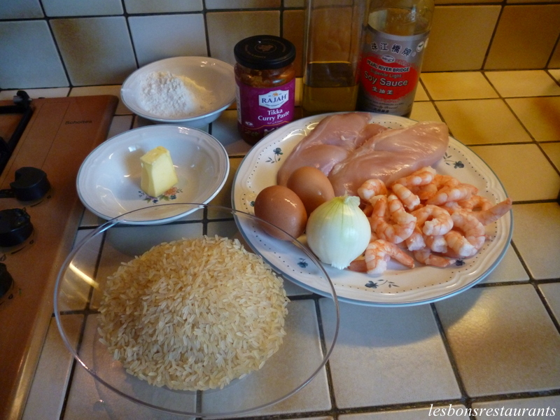 (4 personnes- préparation 10 minutes- cuisson 20 minutes) -250g de riz -1 oignon -20g de beurre -300g de chair de poulet -100g de crevettes cuites et décortiquées -50g de farine -3 càs d'huile d'olive -3 càs de sauce soja -2 oeufs -1 càc de curry tikka -sel, poivre Faites cuire le riz dans un grand volume d'eau.