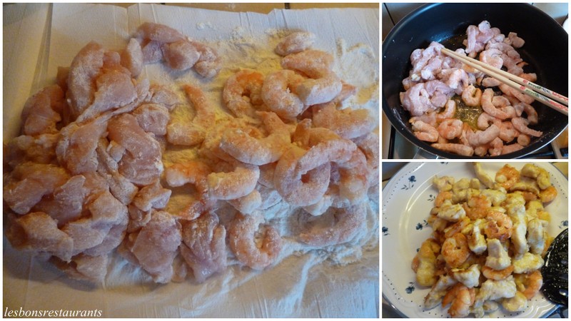 Égouttez-le. Pendant ce temps, coupez la chair du poulet en petits dés. Salez-les et poivrez-les. Roulez-les dans la farine. Procédez de même pour les crevettes. Faites, alors, revenir poulet et crevettes dans une poêle avec un filet d'huile d'olive. Réservez au chaud!