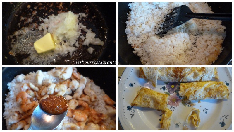 Faites-le revenir dans une poêle avec un morceau de beurre. Ajoutez-y le riz, le poulet et les crevettes. Assaisonnez avec la sauce soja et la pâte de curry. Mouillez avec un peu d'eau si nécessaire et laissez cuire 5 minutes tout en mélangeant soigneusement. Cassez les oeufs séparément et faites-les cuire, toujours séparément en omelette très fines. Coupez vos deux petites omelettes en lanières juste au moment de servir.