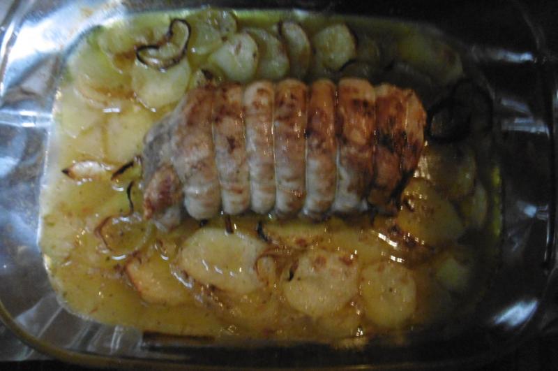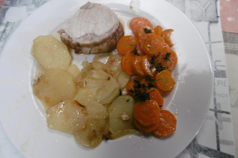 un repas tout simple! roti de porc au four avec pommes de terre coupées tres fines