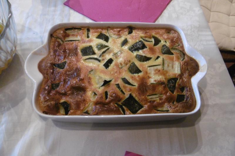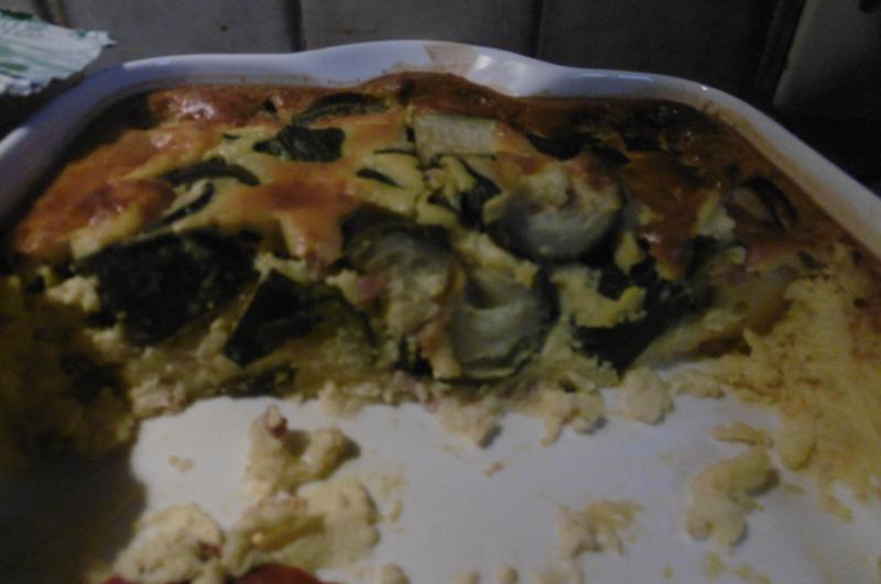 500grs courgettes 4oeufs 2 cuillsà soupe maizéna 1 verre de lait 12 cl de crème fraîche jambon coupé en petits morceaux, gruyère rapé. 30mns de cuisson.