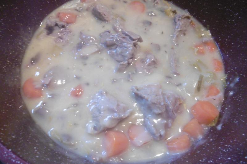 faire un rouxen ajoutant le jus de cuisson, ajouter le roux à la viande, completer avec les champignons cuire i quart d'heure, mélanger la crèmeet le jaune d'oeuf un peu de jus de citron, parsemer de persil.