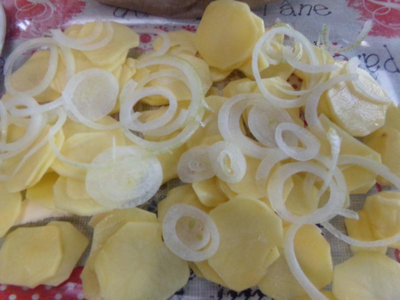 pour la crème:beurre fondu, 3oeufs, 150ml de lait(lait d'amande) farine 120gr j'ai épluchée et coupée en tranches fines les pommes de terre ainsi que l'oignon