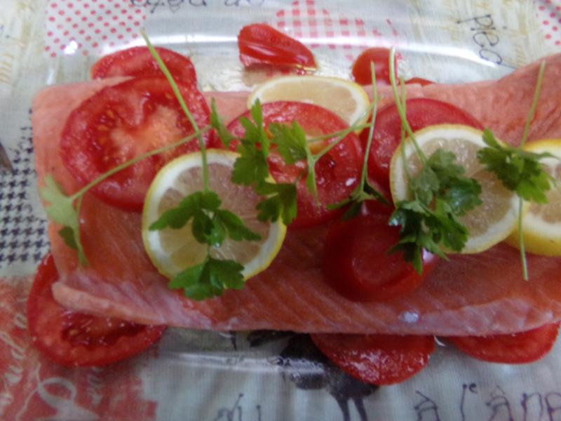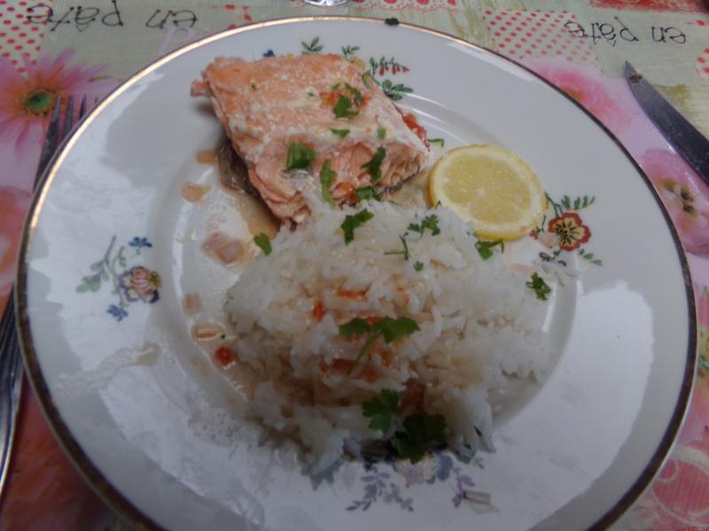 sur un lit de tomates, posée le filet oignons, sel poivre, citron, un peu de persil plat du jardin, et vin blanc, accompagné de riz, ma fille cadette est venue rechercher son chien, elle était partie à la montagne.