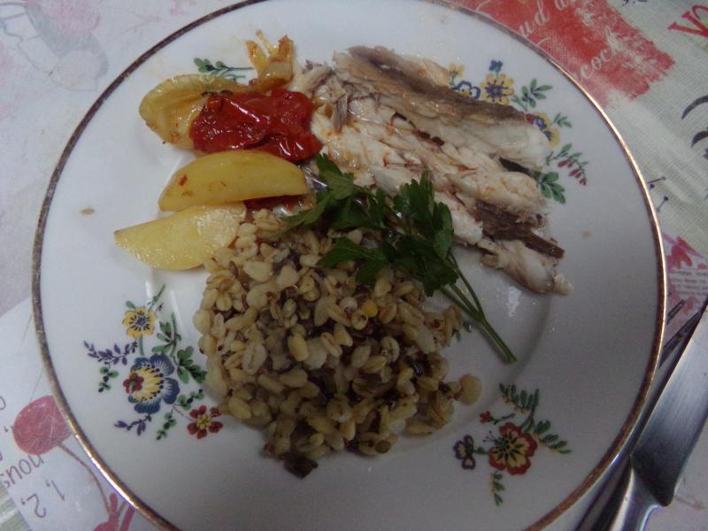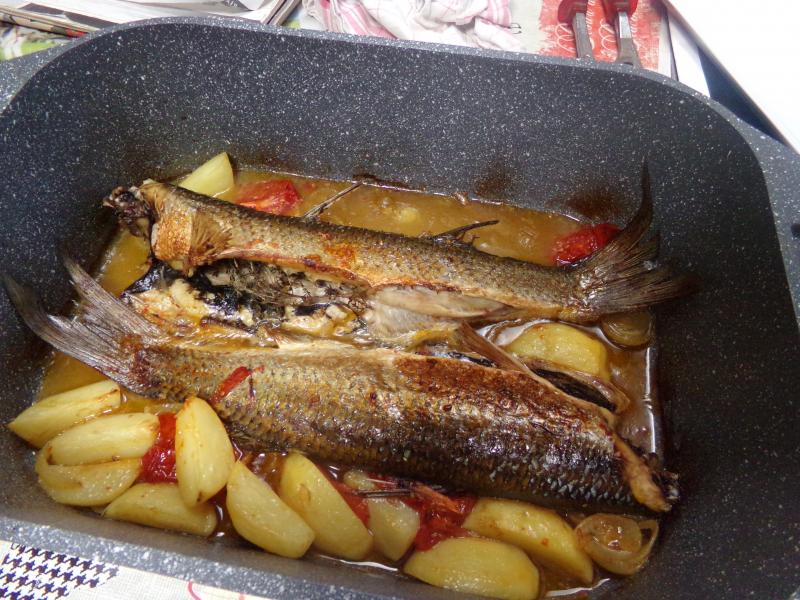 un vrai régal! l' intérieur garnis de thym, sel poivre, huile d'olive;vin blanc, tomates, oignons.