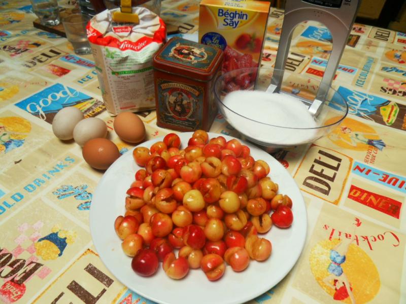 750g cerises 100g farine 1/2 sachet levure 4 oeufs 125g sucre 2p sel denoyautez les cerises